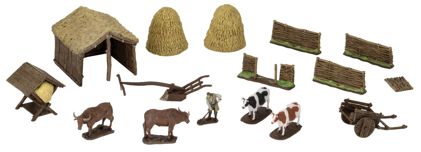 The medieval farmer is the latest of WizKids 4D settings to hit the market. These scenes offer more than just pre-painted miniatures for you, They offer exciting new play experiences and storytelling narrative. With the medieval farmer set, you`ll be provided with all the pieces youd need to put together a scene of a farmer working his fields and farm. You may meet the Farmer in his shed, milking cows. Or perhaps he`ll need someone to help escort him and his cart full of goods into town for the market. DMs and players are provided with the tools to create a memorable Game experience.